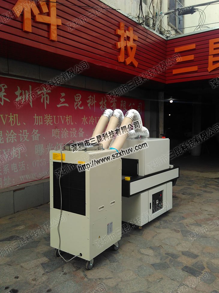 uv固化爐,旁邊的風(fēng)冷輸送機(jī)是客戶(hù)提供的。這款移動(dòng)式冷氣機(jī)SAG-65是三出氣口對(duì)